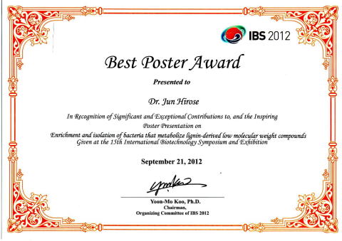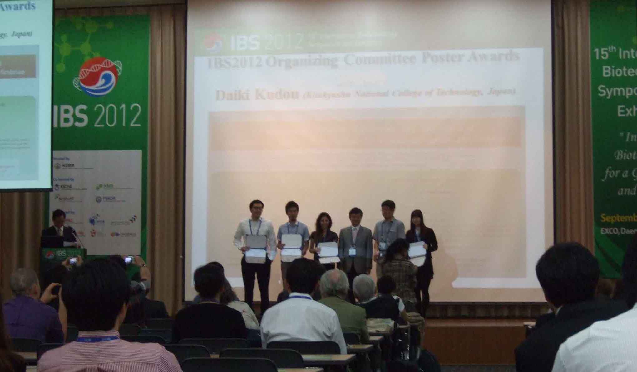 当研究室からのポスター研究発表が国際バイオテクノロジーシンポジウム(IBS2012)で受賞しました。