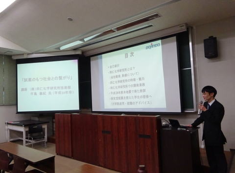 恒例の環境応用化学科・学生懇談会にて、本研究室OBの平島義紀氏(H14年卒 (株)同仁化学研究所 技術部)による特別講演会が開催されました。 「試薬と社会との繋がり」というタイトルで新しい試薬の開発にまつわる話の他、熊本震災から学んだ減災などの非常に興味深い話を拝聴しました。