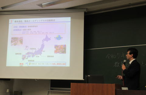 恒例の教員と学生との懇談会にて、本研究室OBの上西由弘氏(2007年度修士卒 霧島酒造(株)グリーンエネルギー部)による特別講演会が開催されました。 本学在学中のエピソードの他、日頃の勤務先での業務、就職活動・社会人に向けての心構えなどとても参考になる講演をしていただきました。