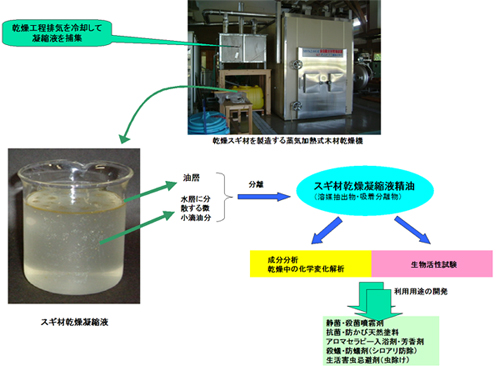 スギ材の水蒸気を用いる高温低湿乾燥中に得られるスギ材乾燥排出液に含まれる有機物質を明らかにし、利用用途を開発する目的で研究を行った。