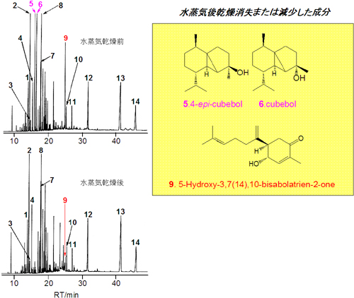 ・水蒸気乾燥スギ材および未処理スギ材の溶媒抽出分画物をGCMS分析した結果、スギ材に多く含まれているセスキテルペンの中で、少なくとも3種類の成分が水蒸気乾燥中に化学変化することがわかった。