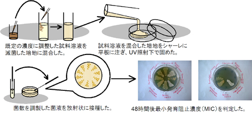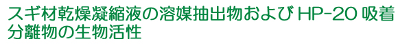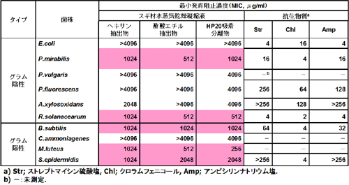 ・細菌に対する抗菌活性は、ヘキサン抽出物より酢酸エチル抽出物およびHP-20吸着分離物が抗菌活性が若干強く、グラム陰性菌よりグラム陽性菌に対して抗菌活性が高い傾向を示した。 ・抗蟻活性や生活害虫忌避(虫除け)の効果も探索中である。